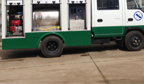 衛(wèi)生防疫車(chē)是一種可通過(guò)電腦來(lái)控制藥物的兌比濃度、并可自動(dòng)灌裝,攪拌的新型白蟻防治車(chē)。其特點(diǎn)是此白蟻防治車(chē)上有配藥系統(tǒng),噴藥系統(tǒng),攪拌系統(tǒng)及清洗系統(tǒng)。此車(chē)上配有兩個(gè)罐體,采用上下疊加式連接,上部罐體為清水箱,下部罐體為配藥箱。在罐體前部另外配有單獨(dú)的藥箱(液體藥物),藥箱上部安裝電腦控制系統(tǒng),后部安裝加藥機(jī),另在整車(chē)后部安裝有高壓泵及卷盤(pán)。配藥時(shí)只需按所需的比例在電腦上輸入所需要的加水量及加藥量即可自動(dòng)配藥。當(dāng)藥物通過(guò)加藥機(jī)輸入到配藥箱后,即可啟動(dòng)車(chē)輛的攪拌系統(tǒng)。另外此車(chē)輛還單獨(dú)配有粉狀藥物灌裝到配藥箱的功能,只需將粉狀藥物倒入其單獨(dú)設(shè)置的投料口即可操作配藥。