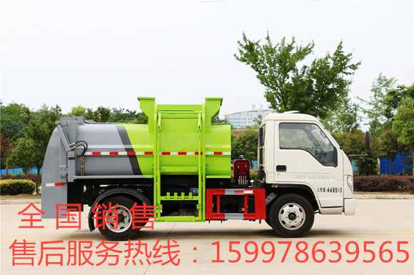 2、車身右側(cè)配液壓掛桶提升機構(gòu),可掛國標 120/240 升垃圾桶,由油缸驅(qū)動通過拉桿裝置實現(xiàn)機構(gòu)倒料和復(fù)位,提升機與進料口結(jié)合,防止誤操作。