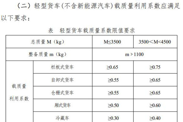 對載質(zhì)量系數(shù)的要求中包含很多專用車型,其中隨車起重運(yùn)輸車、平板貨車、車廂可卸式汽車按欄板式貨車要求執(zhí)行;對于裝有頂蓋的自卸汽車的頂蓋質(zhì)量,應(yīng)計(jì)入整備質(zhì)量,對于隨車起重運(yùn)輸車的起重裝置質(zhì)量,應(yīng)計(jì)入車輛整備質(zhì)量;廂式貨車不包含貨物運(yùn)輸車及由多用途貨車改裝的廂式貨車,倉柵式貨車包括倉柵結(jié)構(gòu)的養(yǎng)蜂車、畜禽車、桶裝垃圾車等運(yùn)輸類汽車。