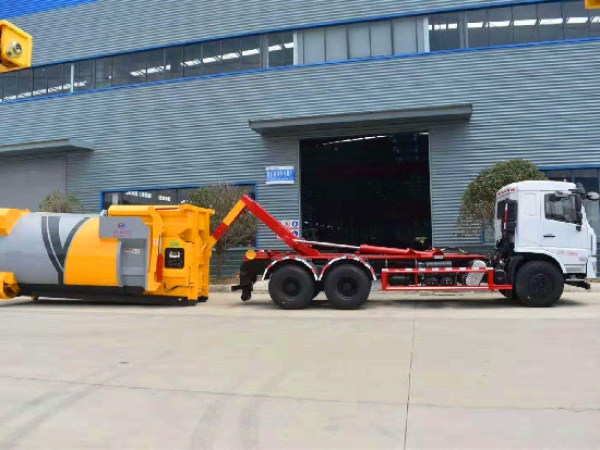 勾臂垃圾車【車廂可卸式垃圾車】車體和垃圾箱可完全分離,由液壓系統(tǒng)來完成收箱/放箱,在平日里可將車載垃圾箱放置到各個垃圾收集點,待垃圾收集滿后,該車可直接開赴收集點,通過液壓系統(tǒng)的操控,可將垃圾車后座上加裝的勾臂放下,掛住站內(nèi)箱體前端的連接點,將垃圾箱拉**車體的后座上,此時即可開動車輛,將垃圾運送垃圾處理站內(nèi),進(jìn)行自卸式傾倒,優(yōu)點就是可一車配多斗,一輛車就可以維持?jǐn)?shù)個垃圾收集站的運轉(zhuǎn),效率高,且箱體為密封式設(shè)計,不會造成二次污染。